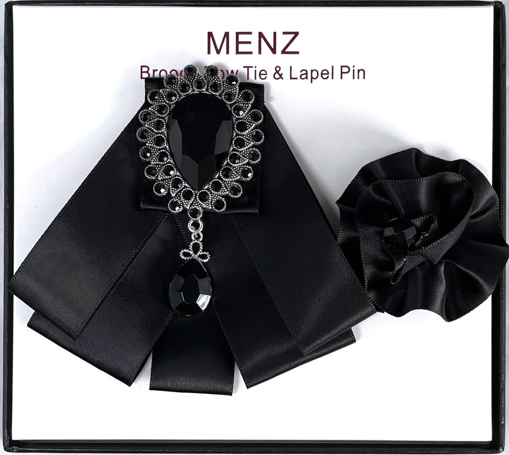 • Layered ribbon bowtie brooch gemstone centerpiece, and a dangling teardrop gem. Comes with a matching lapel flower pin.