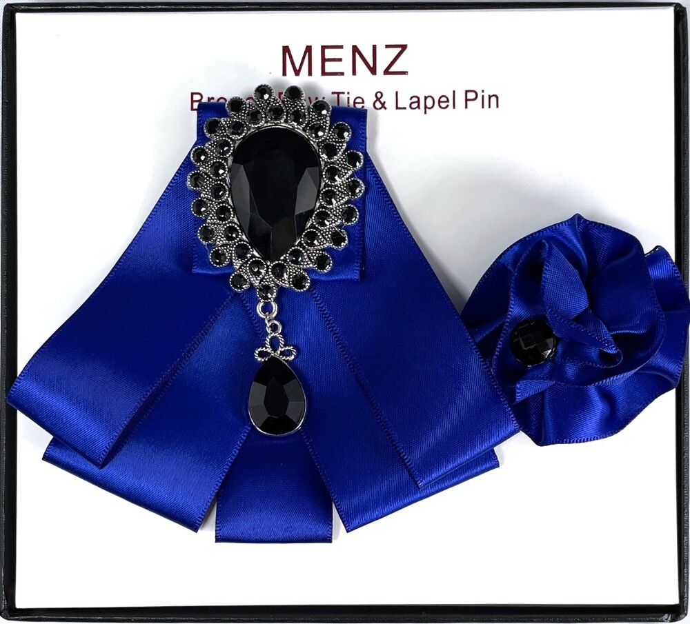 • Layered ribbon bowtie brooch gemstone centerpiece, and a dangling teardrop gem. Comes with a matching lapel flower pin.